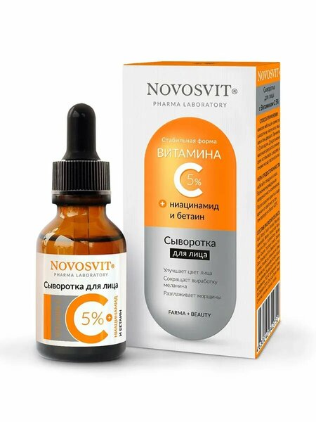 Novosvit сыворотка для лица с витамином с 5% - выравнивает тон кожи, сокращает выработку меланина, улучшает состояние кожи с акне, придает ей естественное здоровое сияние. Стабильная форма витамина С 5% + ниацинамид, натуральный бетаин. Стабильная форма витамина С (Sodium Ascorbyl Phosphate) дольше сохраняет свойства по сравнению с другими формами. Обладает антиоксидантными свойствами, стимулирует выработку коллагена, благодаря этому повышается гладкость, упругость и тургор кожи. Улучшается состояние кожи с акне. Бетаин успокаивает кожу, восстанавливает её барьерную функцию и способствует длительному увлажнению. Ниацинамид улучшает состояние кожи, выравнивает тон и благотворно влияет на кожу с розацеа и куперозом, снижая чувствительность кожи к внешним воздействиям. Для всех типов кожи. Выравнивает тон кожи, сокращает выработку меланина, улучшает состояние кожи с акне, придает ей естественное здоровое сияние. Нанесите небольшое количество сыворотки на чистую кожу лица, шеи и декольте. Применять 1-2 раза в день. Для достижения наилучшего результата рекомендуем использовать сыворотку в течение месяца после вскрытия. Объём флакона 25 мл