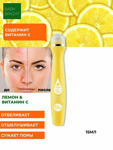 Сыворотка для осветления пигментных пятен, шрамов, постакне, следов от высыпаний и купероза с лимоном и витамином С в удобном экономичном роллере от тайского производителя натуральной косметики Baby Bright — это находка для тех, кто заботится о своем внешнем виде и желает избавиться от пигментации. Сыворотка осветляет кожу, постепенно устраняя недостатки и избавляя от сгустков меланина под кожей, вызванных возрастными изменениями или высыпаниями. Сыворотка освежает, витаминизирует и увлажняет кожу.