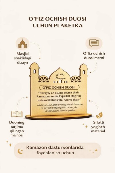 Название товара: Деревянная табличка с дуа для разговения (Рамадан) Краткое описание: Элегантная деревянная табличка в форме мечети с текстом дуа для разговения и переводом смысла. Отлично подходит для украшения праздничного стола в Рамадан, для дома, мечети или в качестве подарка. ⭐ Преимущества: Изящный дизайн в форме мечети Текст дуа для разговения Перевод смысла молитвы Качественный и прочный материал Идеально для Рамаданского стола Подходит в качестве подарка Характеристики: Материал: Дерево Цвет: Натуральный древесный Тематика: Рамадан / Исламский декор Тип установки: Настольный