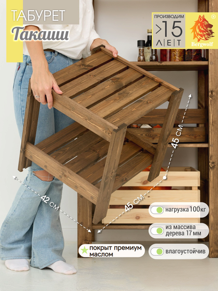 Табурет стремянка от Bergwolf отличается высокой прочностью деталей, долговечностью и устойчивостью. Максимальная нагрузка на одну полку 50 кг, в сумме до 100 кг. Дополнительно поможет взрослым и детям дотянуться до высоких мест. Компактный размер делает изделие мобильным. Войлочные подпятники из комплекта защищают пол от царапин и обеспечивают устойчивость даже на скользких поверхностях. Табурет деревянный для бани и сауны послужит дополнительной зоной отдыха и релаксации. Прекрасно подойдет для прихожей в коридоре, обеспечивая дополнительное место сидения и хранения обуви. Если ищете функциональную и стильную садовую мебель, то наши табуретки идеальный выбор для дачного участка. Они легко перемещаются и могут использоваться в различных условиях, будь то семейный пикник или сбор урожая. Удобно использовать как этажерку под растения, разместив ее на полу или на подоконнике. Стремянка табурет станет прекрасным подарком для ценителей натуральных материалов и современных предметов интерьера. Сочетайте стильные кухонные табуреты и разные модели стеллажей как модули. Мебель для загородного дома или дачи, создаст атмосферу уюта в скандинавском и экостиле. Табуретки для кухни от Bergwolf - это не просто мебель из натурального дерева, это функциональный дизайн, надёжность и качество, которые привнесут уют и порядок в ваш дом, дачу, офис и даже в гараж! Нажав на логотип бренда Bergwolf, вы увидите табуреты в ассортименте и другие товары собственного производства, которых более 130 наименований. Будем благодарны за отзывы и фото ваших стеллажей! Подписывайтесь на наш магазин, чтобы первыми узнавать о новинках и выгодных акциях!