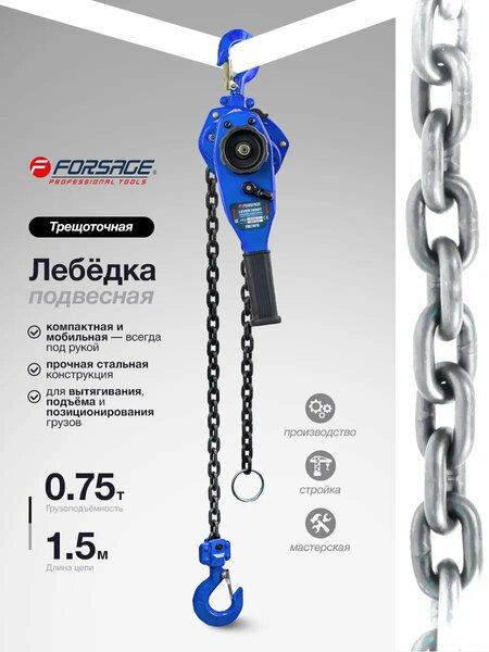 Лебедка подвесная трещоточная 0.75 т. от бренда FORSAGE. Такие лебедки ещё принято называть "таль" — подвесное грузоподъёмное устройство с механическим приводом, состоящее из подвижного и неподвижного блоков и проходящего через их шкивы троса или металлической цепи. Изготовлена из углеродистой стали, обладает долговечностью и надежностью. Лебедка мобильная - легко носить с собой благодаря простой конструкции и небольшим размерам. Цепь крепкая и надежная, запас прочности на разрыв 4:1. Устойчива к коррозии и износу - имеет длительный срок службы. Тормоз премиум-класса обеспечит вашу безопасность во время работы. Механизм тали установлен на прочные стальные пластины и закрыт защитным корпусом - прочная и надежная стальная конструкция. Крюки и элементы подвески имеют 4-х кратный запас прочности и предохранительную защелку. Они могут вращаться на 360 градусов без ограничений, что упрощает работу. Рукоятка имеет нескользящее резиновое покрытие с текстурой, что упрощает эксплуатацию рычажной тали. Характеристики: грузоподъемность 0.75 тонны, длинна троса 1.5 метра, вид - цепная, тип подвески - стационарная. Такие лебедки применимы в автомобильной сфере, строительстве и других областях для перемещения груза. Идеально подходит для портативного использования в мастерских, гаражах, на заводах, складах и др. Лебедкой экономит силу и время, с ней Вам будет очень легко работать.