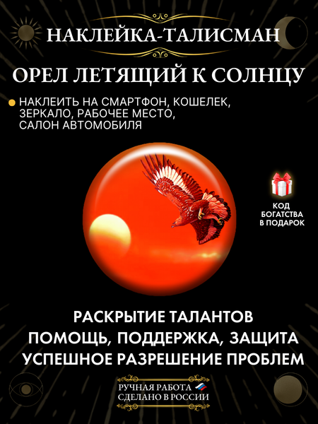 Представляем вашему вниманию непревзойденный амулет от бренда Gold tree - Наклейка-талисман Орел летящий к солнцу. Этот мощный символ власти, успеха, победы, отваги вдохновения станет вашим верным оберегом на каждый день. Изготовленный из смолы, он не только устойчив к воде и агрессивным средам, но и является гордостью российских мастеров. С размером всего 2,5 см, этот талисман легко поместится на любой поверхности - будь то телефон, чехол, интерьер автомобиля или домашний уголок. Талисманы и амулеты давно зарекомендовали себя как мощные атрибуты магии, способные приносить удачу, счастье и благополучие в дом. Наш орел, парящий к солнцу, символизирует не только защиту от сглаза и порчи, но и стремление к исполнению самых заветных желаний. Это идеальное украшение для создания атмосферы благополучия в вашем доме, а также станет замечательным оберегом в дорогу, обеспечивая защиту и поддержку в любых начинаниях. Подойдет как мужчинам, так и женщинам, а также станет символическим подарком для малыша, мечтающего о великих свершениях. Этот амулет не просто декоративный элемент, это объемный символ магической защиты и удачи, который будет служить напоминанием о ваших стремлениях и целях. Сделайте свой выбор в пользу магической атмосферы и уверенности в каждом новом дне с нашим талисманом Орел летящий к солнцу.