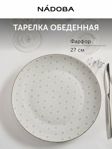 Тарелка обеденная NADOBA, серия MARI LENA, 27 см, фарфоровая, серый, СВЧ, для сервировки, подарочная упаковка