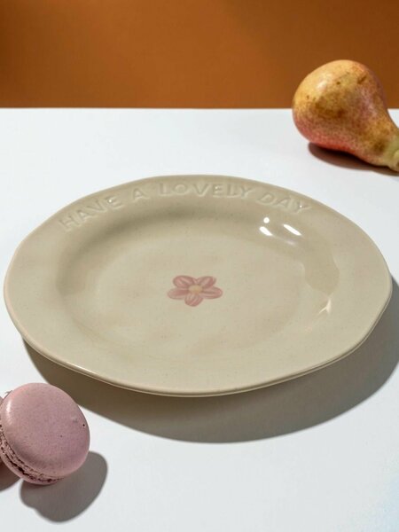 Нежная керамическая тарелка с утончённой надписью Have a lovely day создана, чтобы каждое утро начиналось с тепла и вдохновения. Её мягкий кремовый оттенок и аккуратный цветок в центре создают атмосферу спокойствия и уюта. Идеальна для сервировки завтраков, десертов и красивых моментов дня. Особенности: • Материал: керамика • Диаметр: 20 см • Цвет: кремовый с рельефной надписью и розовым цветком в центре • Подходит для микроволновки и посудомоечной машины Почему стоит приобрести: • Лаконичный дизайн в стиле calm aesthetic • Дарит настроение уюта и заботы • Универсальна: подходит и для повседневной сервировки, и для подарка