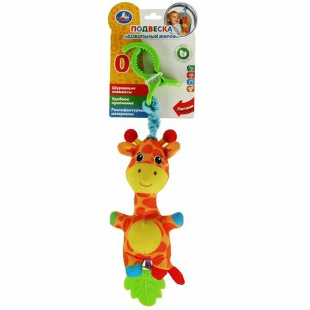 Текстильная игрушка-погремушка «Жирафик» ТМ «УМка» – отличный подарок для самых маленьких: – удобное крепление-клипса – гремящие шарики – яркие цвета – прорезыватель в виде листочка