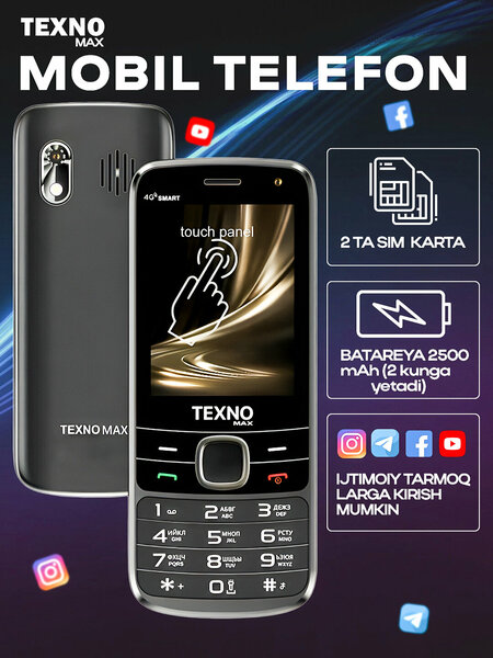 4G SMART — это простой кнопочный телефон, но его внутренние возможности совместимы с системой Android! Простота использования, безграничные возможности Telegram, Instagram, YouTube — все на одном устройстве Делитесь интернетом через функцию 4G-модема Благодаря аккумулятору емкостью 2500 мАч вам не придется беспокоиться о заряде батареи в течение всего дня Громкий звук, два мощных фонарика и современная зарядка Type-C Дизайн и удобное управление - сочетание сенсорного экрана и кнопок Вы можете свободно пользоваться им даже в местах, где невозможно использовать телефон с камерой, благодаря этой модели, которая не имеет камеры, но имеет доступ к Интернету и не утомляет вас Гарантия на обслуживание сроком 1 год распространяется на все регионы и районы. Имейка официально зарегистрирована. Дополнительные возможности андроид 8.1 орео ОЗУ 2 ГБ, ПЗУ 16 ГБ Аккумулятор:= 2500 мАч Экран: 2,8 дюйма WIFI И точка доступа Порт TYPE-C 2 SIM-карты, Флешка Силиконовый чехол, Яркий свет (Фонарик) Удобное программное обеспечение, гарантия на обслуживание 1 год Telegram, Instagram, YouTube — все на одном устройстве! Инструкция Наша модель Max 4G SMART очень проста в использовании и не вызывает никаких затруднений. Если у вас возникли вопросы или трудности, пожалуйста, свяжитесь с нами по официальному номеру компании +998 95 097 11 11, все вопросы и проблемы будут решены в кратчайшие сроки. Сервисные центры работают во всех областях и районах.