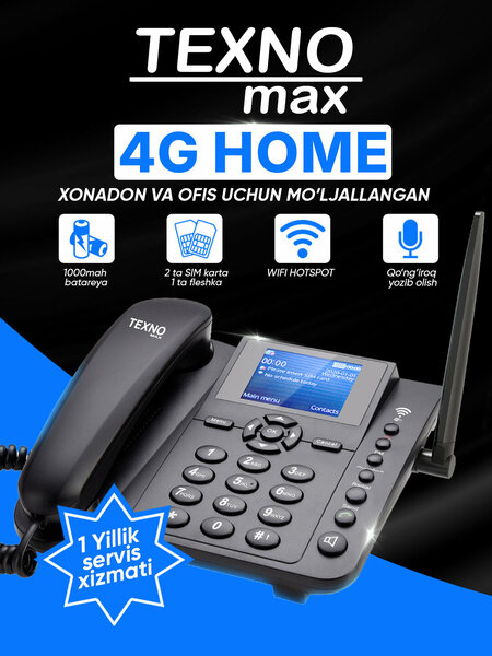 Зачем покупать 4G HOME Один телефон заменяет несколько устройств. Кнопочный телефон, 4G модем, FM-радио, музыкальный проигрыватель в одном устройстве Безопасное и простое управление Даже пожилые люди смогут им легко пользоваться. Крупные кнопки, крупный шрифт, плавный интерфейс — подойдет всем Идеально подходит для офисов Все необходимые средства связи для работы, режим модема и прочная конструкция. Телефон хорошо держит сигнал, а его громкий звук поможет вам общаться с клиентами Удобен для квартир Звонки, музыка, Telegram и интернет для тех, кто дома — без лишних сложностей Им могут пользоваться и дети, и взрослые Доступная цена, широкие возможности Этот телефон полностью соответствует определению «много за небольшие деньги» Если вам нужно простое, надежное, но современное устройство — Texnomax 4G HOME именно та модель, которую вы ищете Экран 2.8 дюйма Аккумулятор 1000 мАч Зарядка типа C и отдельное дополнительное зарядное устройство для себя 2 SIM-карты, 1 флешка Гарантия на обслуживание 1 год (доступна для всех регионов и районов) 2G/3G/4G интернет точка доступа WIFI Процессор MTK, мощная антенна СМС, Радио, Громкий и качественный голос Доступна запись звонков. Инструкция Наша модель 4G HOME очень проста в использовании и не вызывает никаких затруднений. Если у вас возникли вопросы или трудности, просим вас обращаться по официальному номеру компании +998 95 097 11 11, все вопросы и проблемы будут решены в кратчайшие сроки. Сервисные центры работают во всех регионах и районах.
