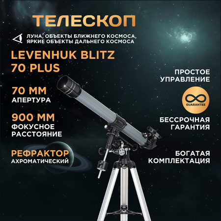 Levenhuk Blitz 70 PLUS – рефрактор-ахромат с исчерпывающей комплектацией. В него можно изучать Луну, планеты Солнечной системы и их спутники, а также яркие объекты дальнего космоса. Телескоп может эффективно работать в условиях городской засветки, удобен и прост в управлении, не требует дополнительных вложений. Также его можно использовать в качестве зрительной трубы для изучения наземных ландшафтов. Этот телескоп – отличный выбор для начинающего астронома. ⠀ В оптической схеме используются стеклянные линзы с антибликовым покрытием. Это положительно влияет на качество передаваемой картинки, делает ее более четкой и ясной. Телескоп укомплектован множеством оптических аксессуаров, что позволяет использовать при наблюдениях разные увеличения. Более того, благодаря фокусеру 1,25 дюйма на телескоп можно устанавливать дополнительные принадлежности с соответствующим посадочным диаметром. Их можно приобрести отдельно, если требуется решить какие-то специфические задачи. ⠀ Для поиска и ведения объектов используется экваториальная монтировка с ручным управлением. Это надежная и простая в обращении монтировка с плавным ходом. Треногу можно регулировать по высоте, она прочная и устойчивая. Тренога сделана из алюминия, в центре находится полочка для аксессуаров. ⠀ Особенности: ⠀ • Рефрактор-ахромат для визуальных наблюдений • Можно рассматривать объекты ближнего космоса и наземные ландшафты • В комплекте есть все необходимое – не нужно ничего докупать • Экваториальная монтировка обеспечивает точное и плавное слежение за планетами • Хороший подарок начинающему любителю астрономии ⠀ Комплектация: ⠀ • Оптическая труба телескопа • Окуляр SR4 мм • Окуляр H12,5 мм • Окуляр H20 мм • Оборачивающий окуляр 1,5х • Линза Барлоу 3х • Диагональное зеркало 90° • Оптический искатель 5х24 • Экваториальная монтировка EQ2 • Ручки тонких движений • Штанга противовеса • Противовес • Крепежное кольцо • Алюминиевая тренога с полочкой для аксессуаров • Инструкция по эксплуатации и гарантийный талон ⠀ Технические характеристики: ⠀ • Оптическая схема: рефрактор • Оптическая схема: ахромат • Материал оптики: оптическое стекло • Покрытие оптики: антибликовое • Диаметр объектива (апертура), мм: 70 • Фокусное расстояние, мм : 900 • Максимальное полезное увеличение, крат: 140 • Светосила (относительное отверстие): f/12.8 • Разрешающая способность, угл. секунд : 12.8 • Проницающая способность (звездная величина, приблизительно): 11.33 • Окуляры: SR4 мм (225х), H12,5 мм (72х), H20 мм (45x), оборачивающий окуляр 1,5x • Посадочный диаметр окуляров, дюймов: 1,25 • Линза Барлоу в комплекте: 3x • Искатель: оптический, 5x24 • Фокусер: реечный • Тренога: алюминиевая • Высота треноги, мм: 670–1230 • Лоток для аксессуаров ✓ • Тип управления телескопом: ручной • Тип монтировки: экваториальная, EQ2 • Способ крепления трубы: крепление кольцами • Материал трубы: металл • Уровень пользователя: для начинающих • Уровень сложности сборки и настройки: просто • Предмет наблюдения: планеты Солнечной системы, наземные объекты • Расширенная комплектация ✓