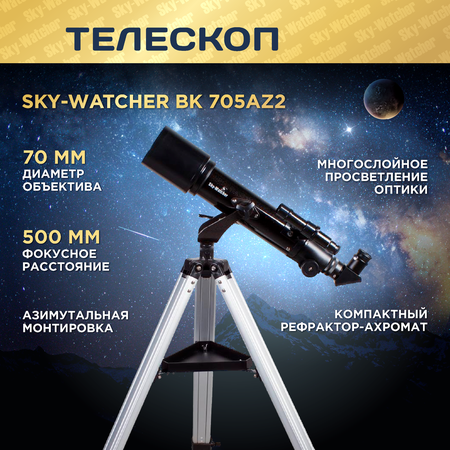 Телескоп Sky-Watcher BK 705AZ2 – компактный рефрактор-ахромат на азимутальной монтировке. Он хорошо подойдет для наблюдений за Луной и объектами Солнечной системы. Небольшой телескоп удобно брать с собой в поездки, поэтому он хорошо подойдет для загородных наблюдений. ⠀ У этой модели ахроматический объектив с апертурой 70 миллиметров. Благодаря качественной оптике изображение получается ярким и четким. На оптические элементы нанесено многослойное просветление – потери света сведены к минимуму. ⠀ В комплект поставки входят 2 окуляра с фокусным расстоянием 10 мм (50x) и 25 мм (20x). Мы рекомендуем сначала всегда вести наблюдения через окуляр с большим фокусным расстоянием. Оптический искатель 6x24 поможет быстро найти на небе астрономические объекты. ⠀ Телескоп комплектуется азимутальной монтировкой. Она проста в управлении и освоении и хорошо подходит для визуальных наблюдений. Монтировка установлена на прочную и легкую треногу из алюминия. Высоту треноги можно отрегулировать под рост наблюдателя. Удобный лоток для оптических аксессуаров обеспечивает дополнительную жесткость конструкции. ⠀ Особенности: ⠀ • Компактный ахроматический рефрактор на азимутальной монтировке • Многослойное просветление оптики, апертура: 70 миллиметров • В комплекте 2 окуляра, линза Барлоу и диагональное зеркало • Прочная алюминиевая тренога с лотком для аксессуаров ⠀ Комплектация: ⠀ • Труба телескопа • Монтировка азимутальная AZ2 • Тренога с лотком для аксессуаров • Искатель оптический 6x24 • Окуляры Super 10 и 25 мм, 1,25" • Линза Барлоу 2x • Диагональное зеркало 90° • Инструкция по эксплуатации и гарантийный талон ⠀ Технические характеристики: ⠀ • Оптическая схема: рефрактор • Оптическая схема: ахромат • Покрытие оптики: полное многослойное • Диаметр объектива (апертура), мм: 70 • Фокусное расстояние, мм: 500 • Максимальное полезное увеличение, крат: 140 • Светосила (относительное отверстие): f/7.1 • Разрешающая способность, угл. секунд: 1.5 • Проницающая способность (звездная величина, приблизительно): 11.9 • Окуляры: SUPER 25 мм, SUPER 10 мм • Посадочный диаметр окуляров, дюймов: 1,25 • Линза Барлоу в комплекте: 2х • Искатель: оптический, 6x24 • Тренога: алюминиевая • Высота треноги, мм: регулируемая, 670–1190 • Лоток для аксессуаров ✓ • Тип монтировки: азимутальная • Дополнительно: есть стандартная Т-резьба (М42) для монтажа зеркальной фотокамеры • Материал трубы: алюминий • Габариты трубы, мм: 70x480 • Вес трубы, кг: 1.4 • Уровень пользователя: для детей, для начинающих • Предмет наблюдения: планеты Солнечной системы