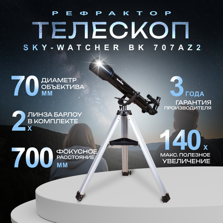 Телескоп Sky-Watcher BK 707AZ2 хорошо подойдет начинающим любителям астрономии: у него простое управление и удобная конструкция. Это рефрактор-ахромат с апертурой 70 миллиметров (его объектив собирает на 36% больше света, чем у телескопа с объективом диаметром 60 миллиметров). В этот телескоп видны кратеры на Луне, пояса Юпитера, кольца Сатурна и другие интересные объекты в Солнечной системе. Оптический прибор подойдет и для ландшафтных наблюдений. ⠀ Благодаря ахроматическому объективу телескоп передает картинку без хроматических искажений, с высокой детализацией и четкими контурами объектов. Многослойное просветление оптики обеспечивает высокое пропускание света и улучшает качество изображения. Телескоп оснащен оптическим искателем 5x24. Реечный фокусер обеспечивает плавную и точную настойку резкости. В комплекте идут два окуляра: 25 мм и 10 мм. Бленда помогает бороться с боковой засветкой. ⠀ Телескоп комплектуется простой азимутальной монтировкой AZ2. Ее быстро освоит даже ребенок, управлять телескопом совершенно несложно. Эта монтировка подойдет для визуальных наблюдений, с ее помощью можно перемещать трубу по горизонтали и вертикали. Телескоп можно быстро подготовить к работе – монтировка поставляется в собранном виде. Лоток для аксессуаров поможет держать под рукой все, что нужно для наблюдений. ⠀ Особенности: ⠀ • Рефрактор-ахромат с просветленной оптикой (апертура 70 миллиметров) • Подойдет для наблюдений Солнечной системы и наземных объектов • В комплекте 2 окуляра, линза Барлоу и диагональное зеркало • Азимутальная монтировка AZ2 на алюминиевой треноге регулируемой высоты ⠀ Комплектация: ⠀ • Труба телескопа • Монтировка азимутальная AZ2 • Тренога с лотком для аксессуаров • Искатель оптический 5x24 • Окуляры Super 10 и 25 мм, 1,25" • Линза Барлоу 2x • Диагональное зеркало 90° • Инструкция по эксплуатации и гарантийный талон ⠀ Технические характеристики: ⠀ • Оптическая схема: рефрактор • Оптическая схема: ахромат • Покрытие оптики: полное многослойное • Диаметр объектива (апертура), мм: 70 • Фокусное расстояние, мм: 700 • Максимальное полезное увеличение, крат: 140 • Светосила (относительное отверстие): f/10 • Разрешающая способность, угл. секунд: 1.64 • Проницающая способность (звездная величина, приблизительно): 11 • Окуляры: 25 мм, 10 мм • Посадочный диаметр окуляров, дюймов: 1,25 • Линза Барлоу в комплекте: 2х • Искатель: оптический, 6x24 • Фокусер: реечный • Тренога: алюминиевая • Высота треноги, мм: 670–1190 • Тип управления телескопом: ручной • Тип монтировки: азимутальная, AZ2 • Дополнительно: есть стандартная Т-резьба (М42) для монтажа зеркальной фотокамеры • Материал трубы: алюминий • Вес трубы, кг: 1.45 • Уровень пользователя: для начинающих • Предмет наблюдения: планеты Солнечной системы