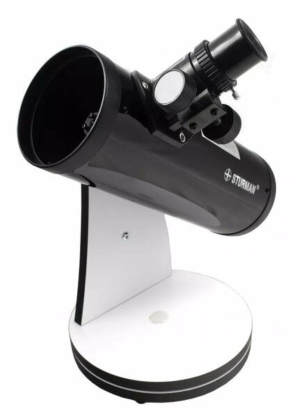 Назначение Sturman DOB 30076(DOB300X76) — недорогой, простой и компактный зеркальный телескоп начального уровня, подходит тем взрослым и школьникам, кто впервые заинтересовался астрономией и только приступил к наблюдениям неба. Благодаря оригинальному дизайну, хорошо впишется интерьер в стиле хай-тек или лофт. Что можно увидеть Хорошо видна Луна. Изучайте в любой фазе, рассматривайте лунную поверхность и кратеры диаметром свыше 8 км. Легко распознаются крупнейшие планеты Солнечной системы: Марс, Меркурий, Венера, Сатурн с его кольцами и Юпитер с его спутниками. За пределами Солнечной системы можно отыскать Туманность Андромеды и яркие двойные звёзды вроде Альберео и Мицар. Наблюдать за Солнцем можно, но непременно с защитным апертурным светофильтром! (покупается отдельно). Наблюдения без фильтра опасны для глаз и могут привести к необратимым повреждениям сетчатки! Конструктивные особенности Sturman DOB 30076(DOB300X76) — классический рефлектор Ньютона с монтировкой Добсона. Простейшая конструкция не нуждается в дополнительной настройке или юстировке, а наведение выполняется без искателя — достаточно переместить трубу в направлении нужного объекта. Изображение перевёрнутое, но не зеркальное, просто вверх ногами с правильной ориентацией лево — право. За планетами наблюдать хорошо, а вот для наземных наблюдений потребуется специальная диагональная призма (приобретается отдельно). Настольная азимутальная монтировка Добсона идеально сочетается с телескопом системы Ньютона: труба располагается низко, и при наведение на небо не нужно выкручивать шею, чтобы заглянуть в фокусёр (особенно сидя на стуле). Собирать не нужно, всё уже установлено и прикручено там, где нужно. Достаёте телескоп из коробки, ставите на стол на открытой лоджии или на улице, выбираете окуляр и можно наблюдать. Окуляров в комплекте два: для поиска и обзорных наблюдений подходит H20 мм (малое увеличение 15x и хорошее поле зрения), для подробного изучения выбранного объекта — H6 мм (большое увеличение 50x). Если же хочется более детальной картинки, используйте штатную линзу Барлоу и повысьте базовую кратность окуляра в 3 раза. Очень простое управление и наведение без искателя. Резкость настраивается при помощи реечного фокусёра: ручки вращаются — и окуляр выдвигается / вдвигается в трубу и тем самым фокусируется на ближе / на дальше. Поворачиваете основание монтировки — труба вращается влево/вправо, ослабляете боковой винт на стойке — и можно наклонять трубу вверх /вниз (после обязательно затяните винт, для фиксации положения). Небольшой размер, устойчивое основание и стильный дизайн. Рефлектор очень компактный, без проблем перемещается с места на место и поедет с вами к бабушке, в отпуск или на дачу. Основание широкое и устойчивое, для защиты от скольжения по столу, полке или подоконнику с обратной стороны основания есть резиновые ножки. А благодаря оригинальному чёрно-белому дизайну, планетарный телескоп Sturman Dob 30076 будет органично смотреться в комнате школьника, кабинете или гостиной в стиле хай-тек (high-tech) или лофт (loft). Комплектация труба телескопа Sturman Dob 30076 штатив настольный с монтировкой, в сборе линза Барлоу 3x 2 сменных окуляра H6 мм, H20 мм краткая инструкция Технические характеристики Оптическая труба Оптическая схема рефлектор Диаметр объектива, мм 76 Фокусное расстояние, м