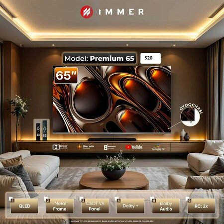 Телевизор IMMER Premium — это сочетание стильного дизайна и современных технологий изображения и звука. QLED-экран обеспечивает яркие, насыщенные цвета и высокую контрастность, а разрешение 4K Ultra HD передаёт максимум деталей даже на большом экране. Модель представлена в двух диагоналях — 55″ и 65″, что позволяет выбрать оптимальный вариант под размер комнаты: • 55″ — для спален и гостиных среднего размера • 65″ — для просторных гостиных и домашнего кинотеатра Операционная система Google TV объединяет фильмы, сериалы и приложения в одном интерфейсе. Поддержка YouTube, онлайн-кинотеатров и голосового управления делает использование максимально удобным. Звук с поддержкой Dolby Audio обеспечивает чистые диалоги и объёмное звучание без необходимости дополнительной акустики. Металлическая рамка подчёркивает премиальный внешний вид и отлично вписывается в современный интерьер.