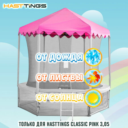 Тент для батута Hasttings Classic – отличная защита для Вас и Ваших детей от дождя, солнца, а также листвы и сора от рядом стоящих деревьев. Теперь для прыжков на батуте зной и летний дождь – не помеха! Этот дополнительный аксессуар, изготовлен с учетом наших климатических особенностей, из влагостойкого матового полиэстера (Polyester) толщиной 0,6мм. Прочность и толщина используемого материала делает тент стойким к воздействию прямых солнечных лучей и высоким температурам, практически исключая деформацию и разрушение покрытия. Крепкая металлическая конструкция каркаса тента надежно крепится на стойках защитной сетки. Высокое качество материала, из которого изготовлен тент обеспечит долговечность эксплуатации и дополнительный комфорт во время нахождения на батуте.