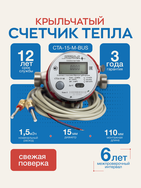 Напрямую от производителя. Всегда свежая поверка и дата изготовления! Счетчик тепла механический (тахометрический) квартирный теплосчетчик/счетчик тепла пульс СТА 15-М (протокол M-bus) предназначен для измерения потреблённой тепловой энергии ( в Гкал) в домах с горизонтальной разводкой систем отопления . Для считывания данных и интеграции в автоматизированные системы контроля и учета энергоресурсов (аскуэ), теплосчетчик использует протокол M-bus. Данная модель является универсальной, подходит для монтажа на подающий и обратный трубопровод, в зависимости от установки термопар. Межповерочный интервал 6 лет! Срок службы 12 лет. Счетная голова прибора не съемная , поворотная. Модель СТА-15 очень компактная, это имеет большое значение в том случае, если в коллекторе место ограничено. Важно! Все теплосчетчики пульс СТА 15 имеют выход под диспетчеризацию (импульсный или RS-485 или M-bus) . Этот выход имеет значение только в том случае, если у вас в доме организован автоматический сбор данных. Если вы снимаете показания визуально, то на этот выход можно не обращать внимание и покупать любой! Если у вас установлен теплосчетчик другого производителя и подошел срок замены, можете приобретать теплосчетчик пульс СТА 15, обратив внимание на диаметр условного прохода ДУ 15 и выход под диспетчеризацию (если она у вас имеется). Монтажная длина у всех квартирных теплосчетчиков стандартная и составляет 110 мм.