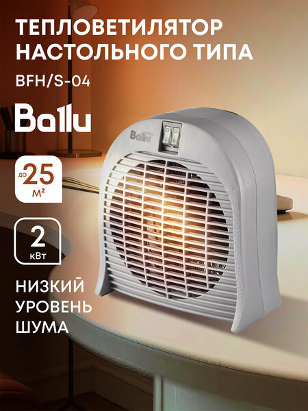 Тепловентилятор BALLU BFH/S-04 максимально прост в эксплуатации и чрезвычайно удобен для быстрого обогрева помещения. Небольшие габариты позволяют без труда переносить его из комнаты в комнату и брать с собой на дачу. Тепловентилятор позволяет регулировать мощность обогрева. Управление прибором Управление прибором осуществляется при помощи блока управления, на котором расположены клавиши переключения мощности работы прибора. Режимы работы Обогрев I (мощность 1000 Вт) Обогрев II (мощность 2000 Вт) Система защиты Прибор имеет термостат безопасности, который защищает тепловентилятор от перегрева и возгорания. Отличительные свойства Ступени мощности: 2000/1000 Вт Высокоэффективный спиральный нагревательный элемент Быстрый обогрев Термостат безопасности (от перегрева и возгорания) Сертификат пожарной безопасности Назначение Спиральный тепловентилятор BFH/S-04 широко используется для обогрева небольших по площади жилых и офисных помещений (особенно в прохладную и сырую погоду). Его применение особенно удобно в местах, где нет иных источников тепла, кроме электричества (например, торговые павильоны, мастерские и т. п.). Дизайн Тепловентилятор выполнен в классическом дизайне. Цвет прибора подобран настолько удачно, что прибор без сомнений будет гармонировать с любым интерьером помещения. Срок гарантии 2 года