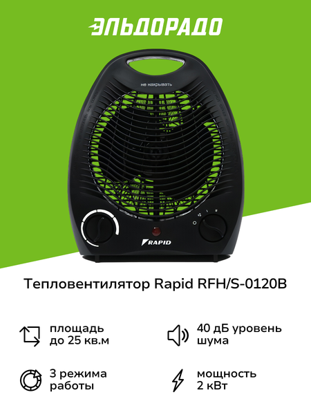 Тепловентилятор Rapid RFH/S-0120B обладает спиралевидным нагревательным элементом и встроенным термостатом. Рекомендуемая площадь помещения - 25 м². • Мощность - 2 кВт Позволяет быстро повысить температуру воздуха до комфортных значений. • Встроенный термостат Обеспечивает стабильное поддержание выбранной температуры воздуха в помещении. • Механическое управление Поворотные переключатели позволяют выбрать один из трех режимов работы. Световой индикатор сообщает о готовности тепловентилятора к работе. • Уровень шума - 40 дБ Устройство не доставляет дискомфорт окружающим при работе в ночное время суток. Тепловентилятор работает от стандартной электросети с напряжением 220 В. Длина сетевого провода - 1,5 м. Модель можно использовать для подачи воздуха без нагревания. Для удобства транспортировки предусмотрена ручка.