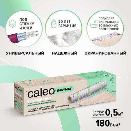 Теплый пол электрический кабельный Caleo Easymat - идеальное решение для комфортного независимого отопления дома, квартиры, дачи или гаража. Предназначен для монтажа под бетон, тонкую стяжку, плиточный клей или наливной пол. Подходит под любое напольное покрытие: керамическую плитку, керамогранит, ламинат, линолеум, ковролин, паркет. Ширина термомата - 50 см, толщина греющего кабеля - 4 мм. Обеспечивает подогрев полов для создания комфортной температуры в любом помещении. Удобная, с постоянным шагом раскладка на сетке для монтажа нагревателя на любых поверхностях даже сложных конфигураций. Повышенная мощность 180 Вт/м2 не только быстрее прогревает поверхность и позволяет насладиться комфортом от обогревающего теплого пола, но и расширяет возможность его применения, позволяя использовать нагревающие маты в качестве основного обогрева комнат. Кухня, ванная, прихожая, гостиная, детская, лоджия или балкон всегда будут находиться в тепле, не прибегая к помощи обогревателей, даже в сезон отключения центрального отопления. Особенности: подходит для стандартных и холодных помещений; двойная изоляция, экранированный 2 двухжильный кабель (провод); защитный экран. Гарантия 20 лет. Строение кабеля: внешняя оболочка из ПВХ; алюминиевая фольга с дренажным проводником; оболочка нагревательных жил-тпее; нагревательная жила. В монтажный набор входит: кабельный мат на сетке; гофрированная труба; инструкция по монтажу с гарантийным талоном. Приобретая комплекты теплых полов Caleo, вы выбираете высокое качество, надежность и комфорт.