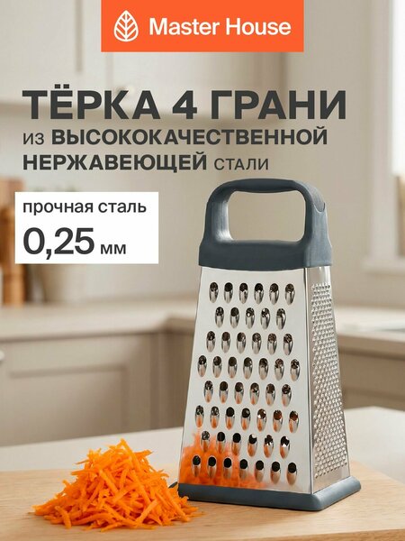 Классическая ручная четырехгранная терка для моркови, овощей и сыра – из нержавеющей стали 0,25мм и алмазной заточкой. Надежная и острая. Компактные размеры посуды 22см на 12см и 10см обеспечивают удобную работу и позволяют разместить аксессуар в любом шкафу. Имеет 4 грани: 1. Стандартная крупная для картошки, морковки и свеклы на поджарку в суп и борщ, или на драники и оладьи. Для колбасы и мясных изделий для салатов. Справится с сырыми и вареными овощами. Можно потереть масло для песочного теста и сыр в запеканку. Часто используют и для корейской моркови вместо квадратной резки. 2. Мелкая терка на широкой стороне - чаще всего используется для сыра и цедры лимона и апельсина. Потереть яйца в мимозу, тесто на обсыпку модель Торта. Для эстетов, предпочитающих мелко нашинкованные овощи в салате или щах. 3. Слайсер – овощерезка на узкой стороне для любителей различных чипсов из твердых овощей. Можно нашинковать огурец или морковь кружочками. Подготовить баклажаны и кабачки для гриля или жарки. Может использоваться как шинковка-капусторезка на заготовки. 4. Звезчатая или колючая – терка для мускатного ореха, измельчения специй, получения цедры. Удобна для измельчения сухого хлеба в сухари или твердых сортов сыра в крошку. Так же, используется вместо пресса для чеснока или для измельчения имбиря в чай и заготовки. Так же, как соковыжималка для томатов. А еще она используется как рыбочистка и отлично убирает чешую. Измельчитель нержавеющий, с силиконовыми элементами. Имеет эргономичную пластиковую ручку: она не врезается в руку при усилии и отлично удерживает кухонный аксессуар на месте. Противоскользящее резиновое основание помогает комфортно использовать терку долгое время, оно плотно прилегает и не дает просачиваться соку и кускам продуктов под кромку. При необходимости силиконовый обод снимается и моется. Ручная тёрка максимально устойчива к износу и поломкам, не ржавеет. Образование грибка или плесени так же исключено. Сталь не впитывает запахов, вкусов, не красится от продуктов. Максимально неприхотлива в уходе: можно мыть в посудомойке. Небольшой размер позволяет брать с собой в долгие походы-пикники на природу, либо хранить на даче.