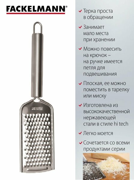 Терка с ручкой FACKELMANN ELEMENTAL, 23,5 см – это удобный и стильный помощник на кухне для натирания овощей, фруктов, сыра, шоколада, орехов, специй. Терка ELEMENTAL проста в обращении, легко моется (рекомендуем мыть под струей воды, нельзя мыть в ПММ), занимает мало места при хранении, можно повесить на крючок – на ручке имеется петля для подвешивания. При использовании терку с ручкой удобно поместить в тарелку или миску, также можно натереть сыр, специи или другие продукты непосредственно над блюдом. Терка ELEMENTAL изготовлена из высококачественной нержавеющей стали в стиле hi tech. Идеально сочетается со всеми продуктами серии FACKELMANN ELEMENTAL, займет достойное место среди аксессуаров на кухне.