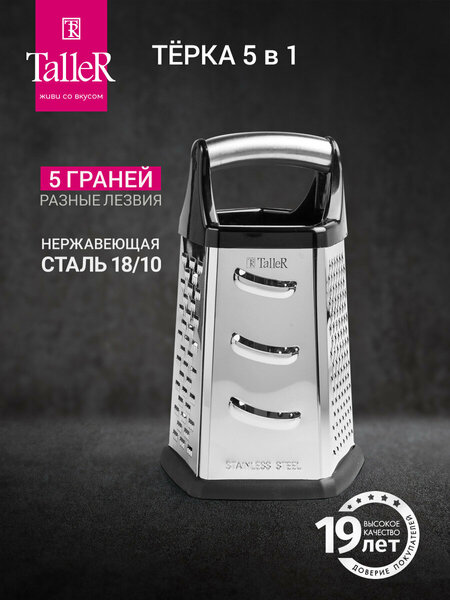 Терка TalleR TR-21909 Джойс 5 лезвий (старый артикул TR-1909) Размеры: высота - 21,5 см, основание - 12,5 х 12,5 см, толщина - 0,3 мм. Материал: высококачественная нержавеющая сталь марки AISI 301. высота - 21,5 см, основание - 12,5 х 12,5 см, толщина - 0,3 мм. 5 видов лезвий: крупная терка, средняя терка, мелкая терка, шинковка, шредер. Ручка со стальной вставкой удобной формы обеспечивает надежную фиксацию в руке Нескользящий силиконовый протектор на основании предотвращает скольжение во время использования и защищает поверхность от повреждений. Пригодна для мойки в посудомоечной машине без использования абразивных моющих средств.