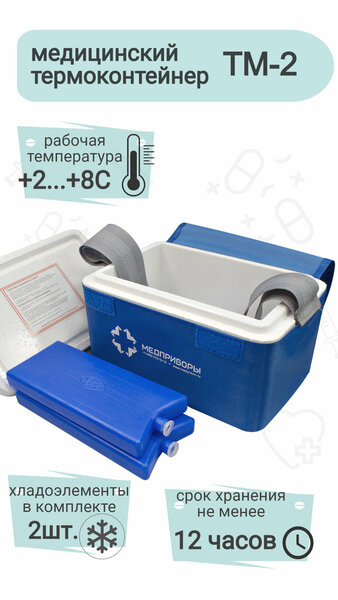Термоконтейнер ТМ2 (1,5 литра) Для транспортировки и временного хранения донорской крови, эритроцитной массы, вакцин, а также кровезаменителей и биопрепаратов при соблюдении температурного режима +2 - +8 градусов. Термоконтейнер изготовлен из пенополистирола. Внутренняя поверхность медицинского термоконтейнера покрыта полистирольной пленкой повышенной прочности, наружная поверхность термоконтейнера защищена чехлом с ручками. Материалы, используемые при изготовлении термоконтейнера и хладоэлементов, не токсичны, разрешены для применения в медицинской практике и внесены в реестр медицинской техники. В комплект входит 2 хладоэлемента по 0,2 литра (наполняются водой и замораживаются в морозильнике покупателя). Объем загрузочной полости – 1,57 литра, без учета хладоэлементов. Объем загрузочной полости с учетом хладоэлементов – 1,17 л; Внутренние размеры: 180х105х80 мм; Вес (с чехлом и хладоэлементами): 0,6 кг; Толщина стенки: 20 мм; Внешние размеры: 220х145х120 мм; Максимальное время установления температуры при температуре окружающего воздуха от +20 до +30 °С – 20-30 минут. Поддерживает температуру рабочую температуру препаратов (от +2 до +8 °С) при внешней температуре +20.+30 °C – не менее 12 часов.