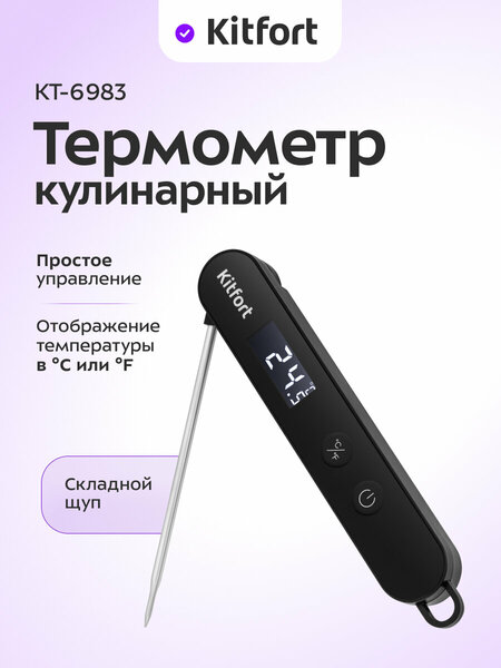 Точность измерений для идеального блюда Кулинарный термометр KT-6983 необходим для точного определения температуры блюд и продуктов, так как секундомер или «на ощупь» не всегда дают точные результаты. Термометр измерит температуру в центре блюда и покажет более точный результат. Контролируйте каждый этап готовки Термометр может измерять температуру от 50 до 300 °C, позволяя точно контролировать приготовление блюд на всех этапах готовки. Он также помогает избежать перегрева или недогрева, что может повлиять на вкус и текстуру готового блюда. Включается одной кнопкой Для включения кулинарного термометра нажмите «Вкл/Выкл». На экране отобразится температура с точностью до 0,1 градуса и выбранная единица измерения — °C или °F. Кнопка «C/F» позволяет переключаться между °C (градусами Цельсия) и °F (градусами Фаренгейта). Работа от батареек типа ААА Устройство работает от одной батарейки типа AAA (не входит в комплект), что обеспечивает его мобильность и удобство использования. Компактные размеры и работа от батарейки позволяют брать устройство с собой в поездки или использовать в разных локациях. Удобная конструкция для комфортной готовки Кулинарный термометр КТ-6983 отличается удобной складной конструкцией, которая позволяет поворачивать его на 180 градусов. Это решение не только экономит пространство на кухне, но и дает возможность устанавливать прибор в любом удобном месте.