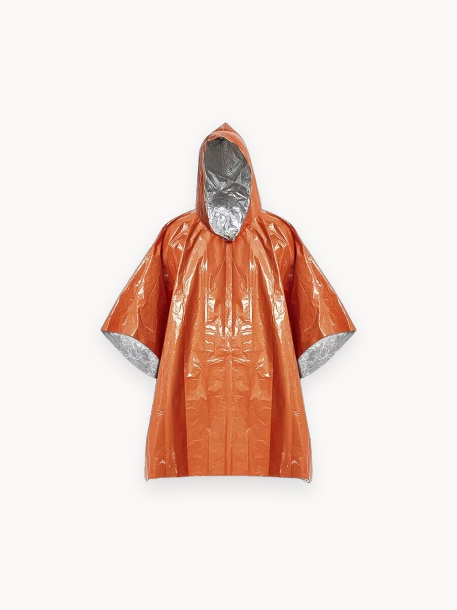 Дождевик - пончо. Этот туристический дождевик защитит Вас от непогоды. Пончо может использоваться как термоодеяло. В определенных ситуациях может служить тентом или настилом. Дождевик туристический представляет собой полиэфирную пленку с напылением металла и имеет изотермические свойства. Ткань является многоразовой. Он имеет яркую расцветку для использования в экстренных ситуациях. Это особенно когда вам необходимо подать сигнал спасателям. Благодаря своей легкой и компактной конструкции без труда помещается в рюкзак или карман. Водоотталкивающий материал защитит от ветра и дождя. Внутренняя сторона из фольгированного материала сохранит тепло. Глубокий капюшон можно использовать, не снимая головных уборов.