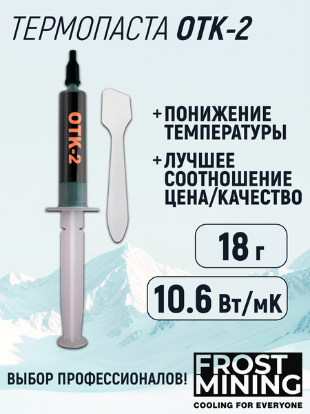 Термопаста OTK-2 от компании FrostMining имеет теплопроводность 10.6Вт/мК. Универсальное решение для вашей техники! Подойдет для стационарных компьютеров, ноутбуков, игровых консолей и т. д. Термопаста умеренно густая, и обеспечивает отличный теплообмен между процессором и радиатором, а также не высыхает при длительной эксплуатации, обеспечивая стабильный отвод тепла от процессора. Термопаста ОТК-2 от FrostMining - это отличное решение для замены заводской некачественной пасты. Наша термопаста подходит для множества интерфейсов, отвод тепла на которых осуществляется с помощью радиаторов, прилегающих к чипу, и где конструктивно предусмотрено использование термопасты. Инструкция по применению термопасты: Примечание: не используйте термопасту вместо термопрокладок. 1) Если вы решили заменить уже имеющуюся термопасту, то для начала нужно очистить процессор и подошву радиатора от старой термопасты; 2) Обезжирьте систему охлаждения спиртом; 3) Нанесите небольшую каплю термопасты на процессор; 4) Возьмите лопаточку и с её помощью равномерно размажьте термопасту по всей площади процессора тонким слоем; 5) При помощи ватной палочки уберите излишки термопасты, которые вышли за край; 6) Установите радиатор и закрутите Комплектация Термопаста + лопатка для нанесения