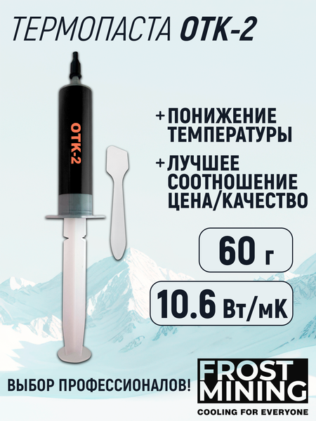 Термопаста OTK-2 от компании FrostMining имеет теплопроводность 10.6Вт/мК. Универсальное решение для вашей техники! Подойдет для стационарных компьютеров, ноутбуков, игровых консолей и т. д. Термопаста умеренно густая, и обеспечивает отличный теплообмен между процессором и радиатором, а также не высыхает при длительной эксплуатации, обеспечивая стабильный отвод тепла от процессора. Термопаста ОТК-2 от FrostMining - это отличное решение для замены заводской некачественной пасты. Наша термопаста подходит для множества интерфейсов, отвод тепла на которых осуществляется с помощью радиаторов, прилегающих к чипу, и где конструктивно предусмотрено использование термопасты. Инструкция по применению термопасты: Примечание: не используйте термопасту вместо термопрокладок. 1) Если вы решили заменить уже имеющуюся термопасту, то для начала нужно очистить процессор и подошву радиатора от старой термопасты; 2) Обезжирьте систему охлаждения спиртом; 3) Нанесите небольшую каплю термопасты на процессор; 4) Возьмите лопаточку и с её помощью равномерно размажьте термопасту по всей площади процессора тонким слоем; 5) При помощи ватной палочки уберите излишки термопасты, которые вышли за край; 6) Установите радиатор и закрутите Комплектация Термопаста + лопатка для нанесения