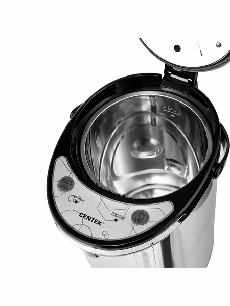 Современные технологии позволяют наслаждаться горячими напитками в любое время без лишних хлопот и ожидания. Термопот прекрасно справляется с поддержанием температуры воды. По сравнению с конкурентами чайник термопот Centek демонстрирует лучшую теплоизоляцию. Термос-чайник характеризуется высокой энергоэффективностью и быстрым нагревом. Термопот Centek сочетает в себе стильный дизайн и передовые технологии. Благодаря системе поддержания температуры он всегда готов подарить вам горячий напиток. Модель заслужила доверие потребителей благодаря своей надежности. Термопот Centek CT-1084 нагревает воду и затем автоматически поддерживает ее горячей, экономя электроэнергию, воду и ваше время. Внутренняя камера и корпус термопота выполнены из долговечной и безопасной нержавеющей стали. Подача воды осуществляется 2 способами: нажатием на кнопку и нажатием на рычаг чашкой. Объем камеры – 6 литров. В термопоте предусмотрена шкала уровня воды. Прибор имеет функции повторного кипячения, защиты от включения без воды и защиты от перегрева. Безопасная система блокировки. Термопот оборудован вращающейся подставкой, удобной ручкой для транспортировки и имеет LED-индикаторы работы. Прибор удобен в использовании и прост в уходе Технические характеристики: Мощность - 850 Вт. Материал корпуса - Сталь. Особенности - 2 режима подачи воды, LED-индикаторы работы, Автоотключение при отсутствии воды, Закрытый нагревательный элемент, Защита от включения без воды, Поддержание оптимальной температуры. Гарантия - 1 год. Объем - 6. 0 л. Длина кабеля - 100 см. Режимы - Нагрев, Поддержание температуры. Управление - Механическое, Электронное.
