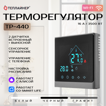 Терморегулятор со встроенным и внешним датчиками температуры для управления любыми системами электрического обогрева мощностью не более 3520Вт/~220В или 3600Вт/~230В (16А) Терморегулятор теплайнер ТР-440 - это устройство, предназначенное для поддержания комфортной температуры в помещении. Сенсорное управление, поддержка управления с телефона по Wi-Fi, четыре цвета отображений индикаторов на дисплее. Он оснащен встроенным и выносным датчиком температуры, что позволяет ему автоматически регулировать температуру в соответствии с вашими предпочтениями. Терморегулятор подходит для использования с любыми системами электрического обогрева мощностью не более 3520Вт/~220В или 3600Вт/~230В (16А). Он может быть установлен с резистивными нагревательными кабелями и матами, инфракрасными пленочными полами и другими системами электрического обогрева. В комплект поставки входят терморегулятор, датчик температуры пола, крепежные винты и инструкция пользователя. Управляется с мобильного приложения Tuya/Smart Life APP по Wi-Fi соединению, также устройство подключается к Яндекс Алисе. Это позволяет вам запрограммировать или задавать индивидуальные режимы работы в течение дня с различной температурой, а также включать и выключать систему электрообогрева "теплый пол" в удобное для вас время. Подключение к приложению: Включите терморегулятор и удерживайте кнопки » и «▲» в течении 5 секунд пока индикатор Wi-FI не замигает на экране терморегулятора. Далее в приложении Smart Life выберите опцию «добавить устройство».