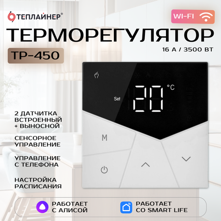 Терморегулятор теплайнер ТР-450 - это устройство, предназначенное для поддержания комфортной температуры в помещении. Сенсорное управление, поддержка управления с телефона по Wi-Fi, стильный дизайн. Он оснащен встроенным и выносным датчиком температуры, что позволяет ему автоматически регулировать температуру в соответствии с вашими предпочтениями.