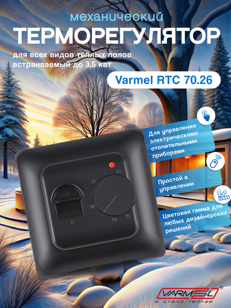 Терморегулятор для всех видов электрических теплых полов. Классический механический терморегулятор Varmel RTC 70.26 для управления электрическими отопительными приборами, встраиваемый в стандартную монтажную коробку. Выносной температурный датчик пола (NTC, 10 кОм) размещается непосредственно в полу, температурный датчик может быть установлен на расстоянии до 3 метров от прибора. Терморегулятор монтируется за пределами зоны повышенной влажности, а выносной температурный датчик прекрасно справляется с контролем внутренней температуры помещения, датчик замеряет температуру, передает ее значение на 70.26, который в свою очередь дает команду на включение или отключение теплого пола. Терморегулятор RTC70.26 устанавливается в стандартную монтажную коробку (подрозетник). Максимальная нагрузка - 3500 Ватт. Напряжение 230 В при частоте 50 Гц. Диапазон установки температур от +5 до +40 С. Выносной датчик пола - 3 м. Гарантия 1 год.