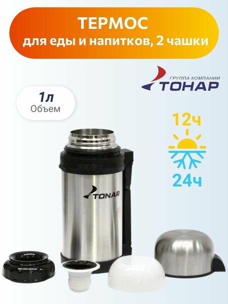 Термос для еды с широким горлом 1 литр и чая с двумя чашками тонар HS. TM-010