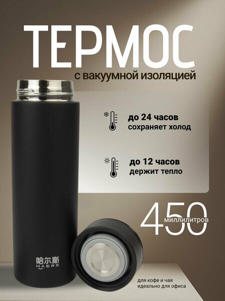 Термос Haers "Enjoy", нержавеющая сталь, 450мл, с ситечком, черный