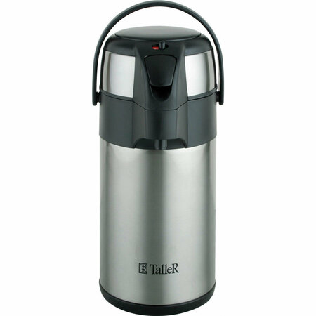 Taller TR-2400 Бартон термос Термос 2,5 л Количество предметов, шт. - 1 Материал корпуса - нержавеющая сталь 18/10 и пищевой пластик Материал колбы – нержавеющая сталь 18/10 Полировка – матовая Теплоизоляция – вакуум Тип пробки – помповый Ручка – пластиковаяТермос изготовлен из высококачественной нержавеющей стали марки 18/10: обладает высокими антикоррозийными свойствами; прочен и устойчив к деформации; устойчив к воздействию кислот и щелочей; не изменяет вкусовые качества, запах и цвет напитков, т. к. не вступает в реакцию с ее компонентами; легко моется. Пищевой пластик, используемый в термосе: соответствует гигиеническим требованиям, т. к. не выделяет вредных для здоровья элементов; устойчив к деформации; способствует сохранению температуры; препятствует чрезмерному нагреву самой крышки. Двойные стенки и находящийся между ними вакуум минимизируют теплообмен, а внутренние стенки термоса отражают температуру содержимого. Медное покрытие внутренней колбы со стороны вакуума повышает прочность колбы, способствует быстрому ее прогреву и служит для поддержания температуры внутри термоса. Высокий вакуум между стенками колбы блокирует теплопроводность, предотвращает нагревание внешней стенки термоса, даже если он наполнен кипятком. Сталь термоса проходит специальную обработку - дегазацию, благодаря которой продлевается период действия вакуума, улучшается прочность изделия. Удобная кнопка большого диаметра удобна в использовании и позволяет легко наливать напитки простым нажатием ладони. Специальный клапан на крышке позволяет легко ее открыть. Переключатель позволяет заблокировать кнопку помпы и предотвращает расплескивание жидкости. Вращающееся основание позволяет повернуть термос, не поднимая его. Удобная компактная ручка позволяет легко переносить термос и не требует дополнительного места.
