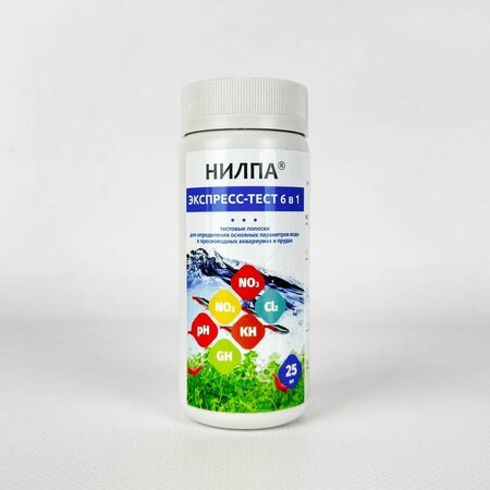 Нилпа тест-полоски 6в1 экспресс (25 штук) - позволят одним движением быстро определить сразу 6 параметров воды аквариума. Тест-полоски необходимы в случаях, когда точность капельных тестов не требуется или подробное тестирование недоступно. Определяемые параметры: pH, GH, KH, NO2-, NO3-, Cl2 Применение: 1. Достаньте тест-полоску сухими руками. 2. Погрузите область с реагентами в тестируемую воду на 2 секунды, затем достаньте. 3. Держите тест-полоску горизонтально 60 секунд. 4. Сравните цвета на полоске с этикеткой на банке в течение 30 секунд.