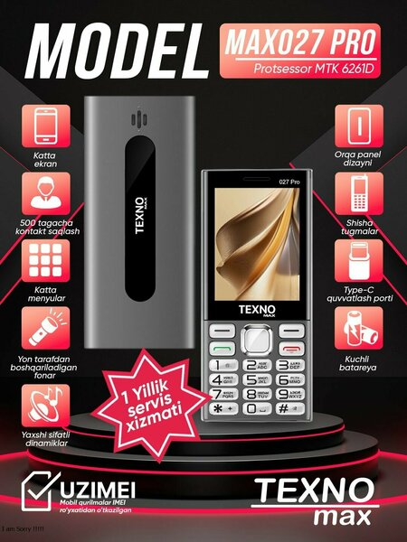 {"widgets":{"@card/UniversalPromoBadge":{"/content/page/fancyPage/defaultPage/universalPromoBadge":{"wrapperProps":{"margins":{"bottom":"3"}},"initialTime":1771838150097,"offerComposeId":"7888192686142083651"}}},"meta":{"/content/page/fancyPage/defaultPage/universalPromoBadge":{"name":"@card/UniversalPromoBadge"}},"collections":{"productServiceSnippets":{"7888192686142083651":{"productSnippet":{"snippetId":"document_id","type":"MODEL_CARD_LAYOUT","productPayload":{"snippetStyle":"NORMAL","title":{"value":"Texno Max 027 Pro кнопочный телефон, два сим, FM радио, серый"},"badges":{},"price":{"actualPrice":{"amount":{"intPart":390000,"currency":"UZS"},"style":"BLACK","type":"WITHOUT_DISCOUNT"}},"gallery":{"mediaItems":[{"picture":{"baseUrl":"https://avatars.mds.yandex.net/get-mpic/17680463/2a0000019c6a00f166c2af3207b2c86c0808/","width":1080,"height":1440,"title":"Texno Max 027 Pro кнопочный телефон, два сим, FM радио, серый"},"type":"IMAGE"},{"picture":{"baseUrl":"https://avatars.mds.yandex.net/get-mpic/2016828/2a0000019c6a00f1668bdbc140fdf6a0f4bf/","width":1080,"height":1080,"title":"Texno Max 027 Pro кнопочный телефон, два сим, FM радио, серый"},"type":"IMAGE"},{"picture":{"baseUrl":"https://avatars.mds.yandex.net/get-mpic/17782800/2a0000019c6a00e7025626eaa5afe96fe44e/","width":1101,"height":898,"title":"Texno Max 027 Pro кнопочный телефон, два сим, FM радио, серый"},"type":"IMAGE"},{"video":{"url":"https://runtime.strm.yandex.ru/player/video/vplviusmwz3hi6icbliu","width":720,"height":1280,"title":"Texno Max 027 Pro кнопочный телефон, два сим, FM радио, серый","preview":{"baseUrl":"https://avatars.mds.yandex.net/get-mpic/15420807/2a0000019a1ad5d6cd69ea525697b107557f/","width":720,"height":1280,"title":"Texno Max 027 Pro кнопочный телефон, два сим, FM радио, серый"},"streams":[{"type":"dash","url":"https://strm.yandex.ru/vod/vh-market-upload-converted/vod-content/vplviusmwz3hi6icbliu/4fa0285a-8b40-455a-9ca3-62511be739e5/kaltura/desc_b2adc7948435e78807dd6a8f41eaaf92/x/ysign1=fca52de7dc9d14fea517d1d02edfe17aa6ab22153ae3f14c6e4d699851cfa230,abcID=56084,chID=vplcw5a4be2almmy7knw,pfx,sfx,ts=699ebdc5,video=vplviusmwz3hi6icbliu/manifest.mpd?packager=1&packman=1"},{"type":"hls","url":"https://strm.yandex.ru/vod/vh-market-upload-converted/vod-content/vplviusmwz3hi6icbliu/4fa0285a-8b40-455a-9ca3-62511be739e5/kaltura/desc_b2adc7948435e78807dd6a8f41eaaf92/x/ysign1=53ace59f40436926cb9fe5ad2a0a8d8aac17aa686639eccb88bbad4f7efc33ea,abcID=56084,chID=vplcw5a4be2almmy7knw,pfx,sfx,ts=699ebdc5,video=vplviusmwz3hi6icbliu/master.m3u8?packager=1&packman=1"}],"playerId":"vplviusmwz3hi6icbliu"},"type":"VIDEO"}]},"wishlistButton":{"businessId":216657633,"mskuId":5146306722,"modelId":5146306642,"oskuId":5146306722,"offerId":"i_JkUnCNEHR1cdDCwm98Gw"}},"baobabPayload":{"type":"offer","wareId":"i_JkUnCNEHR1cdDCwm98Gw","modelId":5146306642,"marketSku":"5146306722","snippet_type":"product","isExpress":false,"price":390000,"hid":60512327,"shopId":431782,"shopSku":"MRKT-8F7JA12W","supplierId":216657632,"supplierType":3,"isUltima":false,"oskuId":5146306722,"snippetTheme":"GRID_FULL","stockCount":30,"promoLogJoinId":"be20c8e3ab1ecdd4fb7fca0989167dca/07087fe9d7e12180"},"themeType":"GRID_FULL"}}}}}