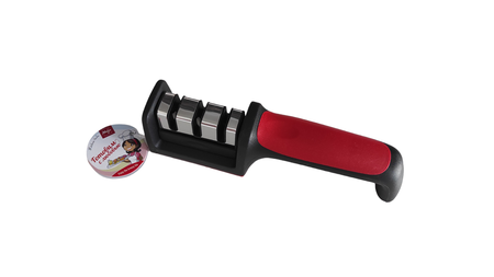 Многофункциональная точилка для ножей подойдёт для быстрой и комфортной заточки, с которой справится даже ребенок. Она имеет 3 зоны заточки и оптимальную зернистость для кухонных и поварских ножей, проста в использовании и прослужит вам долгие годы. Точилка универсальна, подходит правше и левше, компактна и безопасна в эксплуатации. Точило выполнено из ABS-пластика, стали и керамики. Имеет нескользящее основание и удобную ручку. Надёжная сборка и износостойкие материалы гарантируют долгий срок службы. Красный цвет корпуса привлекает внимание, и найти инструмент в ящике среди других принадлежностей будет несложно. Компактные размеры позволят взять с собой в поездку. Точильный станок имеет 3 зоны заточки: 1 – грубая заточка (вольфрамовая сталь), для обработки V-образной формы режущего края лезвия; 2 – деликатная заточка (среднезернистая керамика), для затачивания и восстановления повреждённых лезвий; 3 – доводка лезвия до идеальной остроты (среднезернистая керамика), финишное точение для поддержания остроты лезвия. Съёмная зона заточки облегчает уход (нажмите на неё и потяните вверх). Заточной станок обеспечит безопасную и быструю заточку кухонных принадлежностей. За несколько секунд вы получите лезвие, которое режет бумагу и мягкий помидор. Точило не предназначено для заточки серрейторных (зубчатых) и керамических лезвий, ножниц. Для правильной заточки движения должны быть направлены в одном направлении, на себя. Механическая точилка – полезный подарок, который пригодится в каждом доме. С нами приятно готовить! TM Mielaje