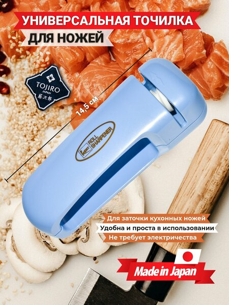 Универсальная точилка для ножей предназначена для заточки и исправления серьёзных изъянов на лезвии. В пазу установлены абразивные элементы, которые закреплены в определённом положении и сами контролируют соблюдение правильного угла заточки при правке лезвия. Приспособление выполнено из уникальных, прочных материалов. При правильном обращении оно прослужит в течении внушительного периода времени и будут радовать острыми кухонными, туристическими и складными ножами. Аксессуар удобен и прост в применении. Не требует электричества и каких-либо других источников питания. Благодаря точилке Tojiro ножи долгое время будут оставаться острыми. Цвет: синий Размер: 144 x 50 x 40 мм Рукоять: пластик Материал: циркониевая керамика