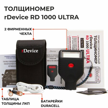 Профессиональный толщиномер RDevice RD 1000 Ultra - максимально возможный функционал, объединенный в одном приборе с максимальной надежностью и самокалибровкой. Не только определяет наличие металлизированной шпатлевки, но и показывает толщину нанесенного слоя краски. Профессиональный датчик с рубиновым наконечником не подвержен истиранию. У приборов с рубиновым датчиком с годами показания не меняются. Помимо этого, данная модель является самой точной на рынке. Проверка наличия оцинковки позволит выявить детали, которые в процессе ремонта были заменены на более дешевые (китайские), без оцинковки. Два режима измерений: любительский и профессиональный (без цветовых подсказок). Турбо-замер - очень высокая скорость измерений, это одна из самых быстрых моделей. Русифицированный интерфейс, а также возможность выбора еще 5 различных языков. Расширенный диапазон измерений до 4000 микрон. Зимний режим: толщиномер адаптирован для работы в зимних условиях до -20 градусов, краткосрочно до -25 -30 гр. При этом, показания толщиномера не "гуляют" в зависимости от температуры. Дополнительные особенности модели:
