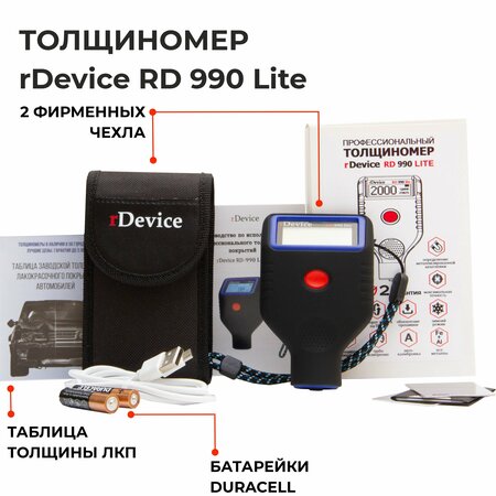 Профессиональный толщиномер rDevice RD-990 Lite - очень быстрый универсальный толщиномер для автоподбора c определением оцинкованных деталей и магнитной, металлизированной шпатлевки. Профессиональный датчик с рубиновым наконечником не подвержен стиранию. У приборов с рубиновым датчиком, с годами показания не меняются. Проверка оцинковки позволит выявить детали, которые в процессе ремонта были заменены на более дешевые (китайские), без оцинковки. Супер скорость измерения - быстрее на 20-30% модели RD-1000 pro (самый быстрый прибор на рынке)! Русифицированный интерфейс. Толщиномер RD-990 как и все приборы линейки rDevice, адаптирован для работы в зимних условиях до -20 градусов, краткосрочно до -25. При этом, показания толщиномера не "гуляют", в зависимости от температуры. Эргономичный дизайн, компактный размер - прибор не просто компактный, он удобный. Изготовлен из качественных материалов. Экран толщиномера для большей защиты утоплен в корпус прибора, и расположен под специальным углом, это позволяет видеть дисплей прибора, производя измерения поверхностей, расположенных под любыми углами. Дополнительные особенности модели Рдевайс RD-990 Лайт: