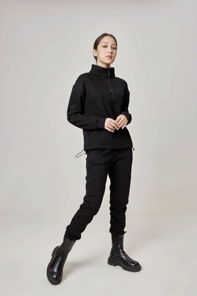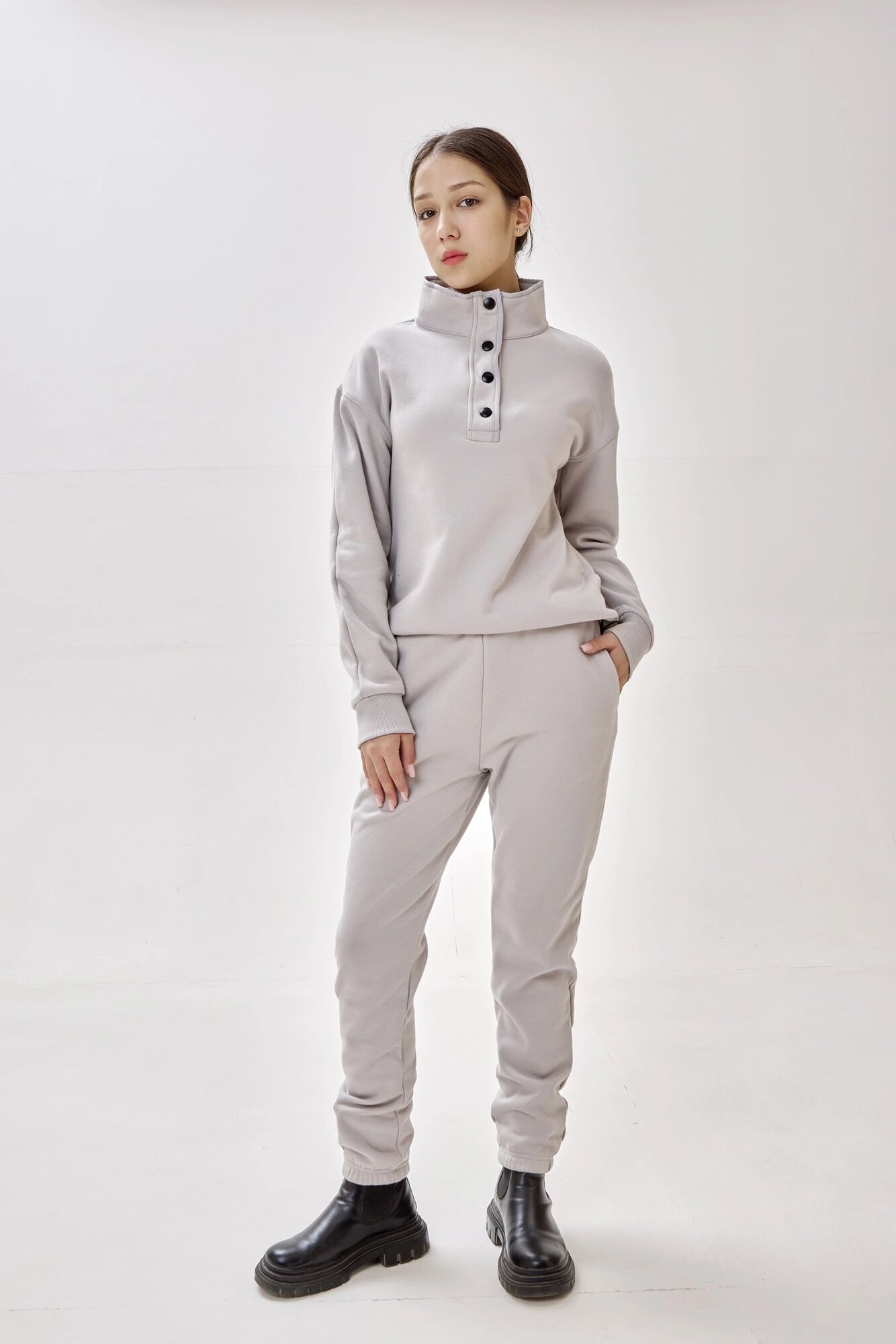 Спортивная толстовка свободного кроя – удобная и практичная вещь, необходимая в каждом гардеробе. Модель имеет спущенную линию плеча, мягкие трикотажные манжеты по рукавам и эластичные утягивающие шнурки по низу. На воротнике стойке небольшая застежка на пуговицы. Толстовку такого типа можно смело надевать и на тренировку, и на встречу с друзьям. Для создания комплекта сочетайте с соответствующими джоггерами.