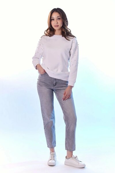 Базовая оверсайз толстовка с круглым воротником и нежным декором на рукавах в виде бусин. Имеет спущенную линию плеча и свободные длинные рукава, что прибавят больше свободы и помогут сбалансировать фигуру с широкими бедрами.