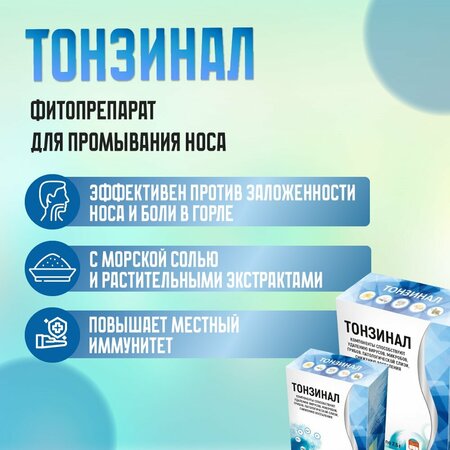 Выпускается в виде саше с морской солью и травяными экстрактами. Морская соль используется в качестве средства для промывания носа, при боли в горле в составе антибактериальной терапии. Промывание носа помогает справиться с насморком, а полоскание снимет боли в горле. Для промывания носа разбавьте антибактериальный порошок в воде и используйте для промывания носа или закапывания. Полоскание горла поможет снять воспалительные процессы. Также морская вода для носа используется и для промывания носоглотки. Антибактериальная терапия поможет быстро избавиться от боли в горле, насморка и других симптомов простуды. В составе порошок от простуды имеет травы для иммунитета и экстракт солодки, которые быстро снимают воспаление. Морская соль для промывания носа безопасна и эффективна, а полоскание для горла избавит от боли в горле в кратчайшие сроки. Соль для промывания носа – средство, проверенное временем, оно безопасно даже для детей. Пользуйтесь Тонзиналом для промывания носоглотки, горла и носа для помощи в лечении любых местных заболеваний. Эффективность неоднократно доказана научными исследованиями (более 10 защищенных научных диссертаций). Способ применения1 пакет (2,5 г) растворить в теплой (не более 40 градусов) воде: при простудных заболеваниях и других оториноларингологических заболеваниях - в 150 мл, при стоматологических заболеваниях - в 100 мл. Используется местно в виде полосканий ротовой полости и зева, промывания носовых ходов, орошения носоглотки, миндалин, лакун и полостей, а так же для закапывания в нос и ингаляции. Применение 3-6 раз в день. Продолжительность применения 7-10 дней в зависимости от состояния. Раствор используется в течение 12-ти часов. При сухости слизистых рекомендуется в 100 мл свежеприготовленного раствора добавить 1/2 чайной ложки растительного масла, тщательно размешать и применять. Допускается естественный осадок природных веществ. Показания: заложенность носа, грипп, боль в горле, антибактериальная профилактика