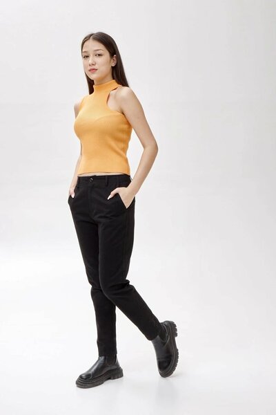 Прилегающий топ с открытыми плечами, асимметричной проймой и высоким воротником стойкой, выполненный из приятного на ощупь вязаного трикотажа. Модель изящно дополнит образ, подчеркнув линию плеч.