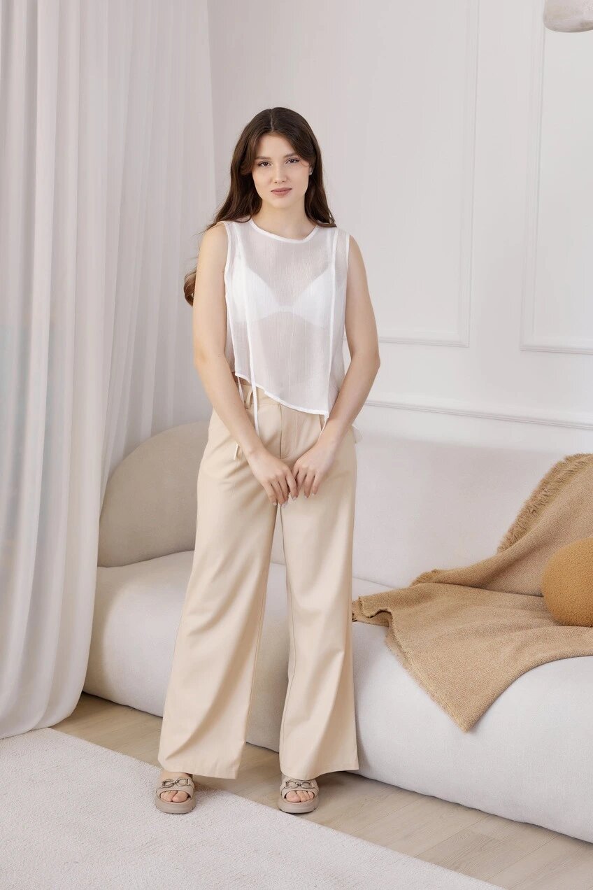 Стильная полупрозрачная блуза без рукавов с декоративными завязками и асимметричным нижним краем. Имеет застежку на пуговицы сзади. Отлично сочетается с брюками, джинсами и бермудами.