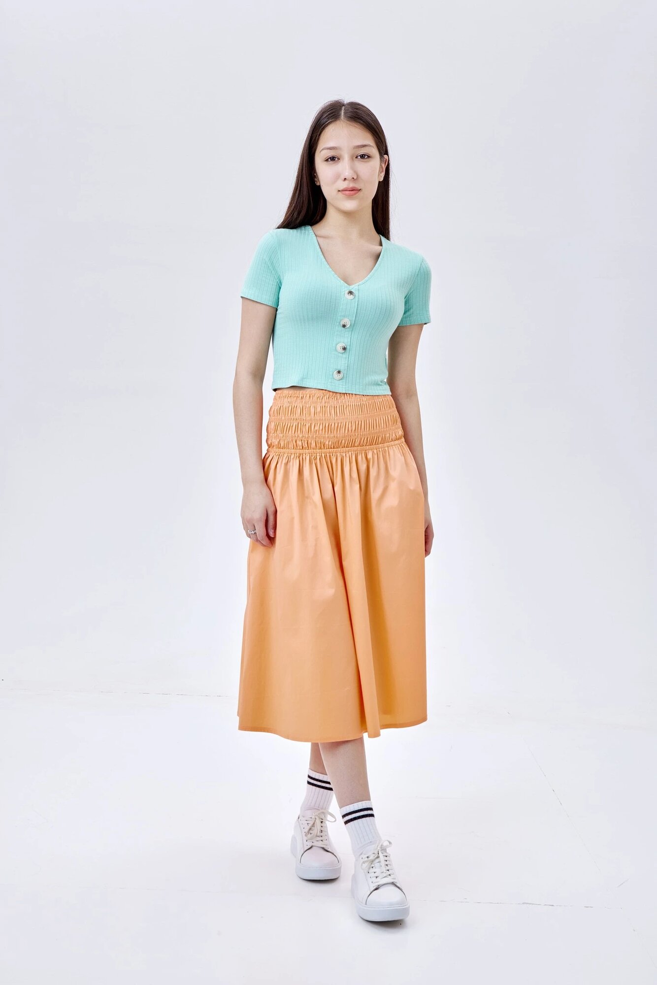 Укороченный топ прилегающего кроя с деликатным V-образным вырезом. Выполнен из приятного к телу фактурного материала. Имеет ряд декоративных пуговиц спереди.