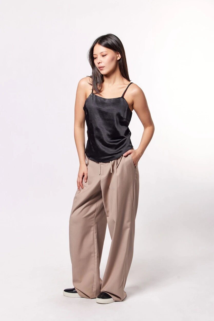 Элегантный сатиновый топ свободного кроя на тонких регулируемых бретелях, дополненный молнией на потайную молнию сбоку. Стильная и комфортная модель для создания офисного или вечернего образа.