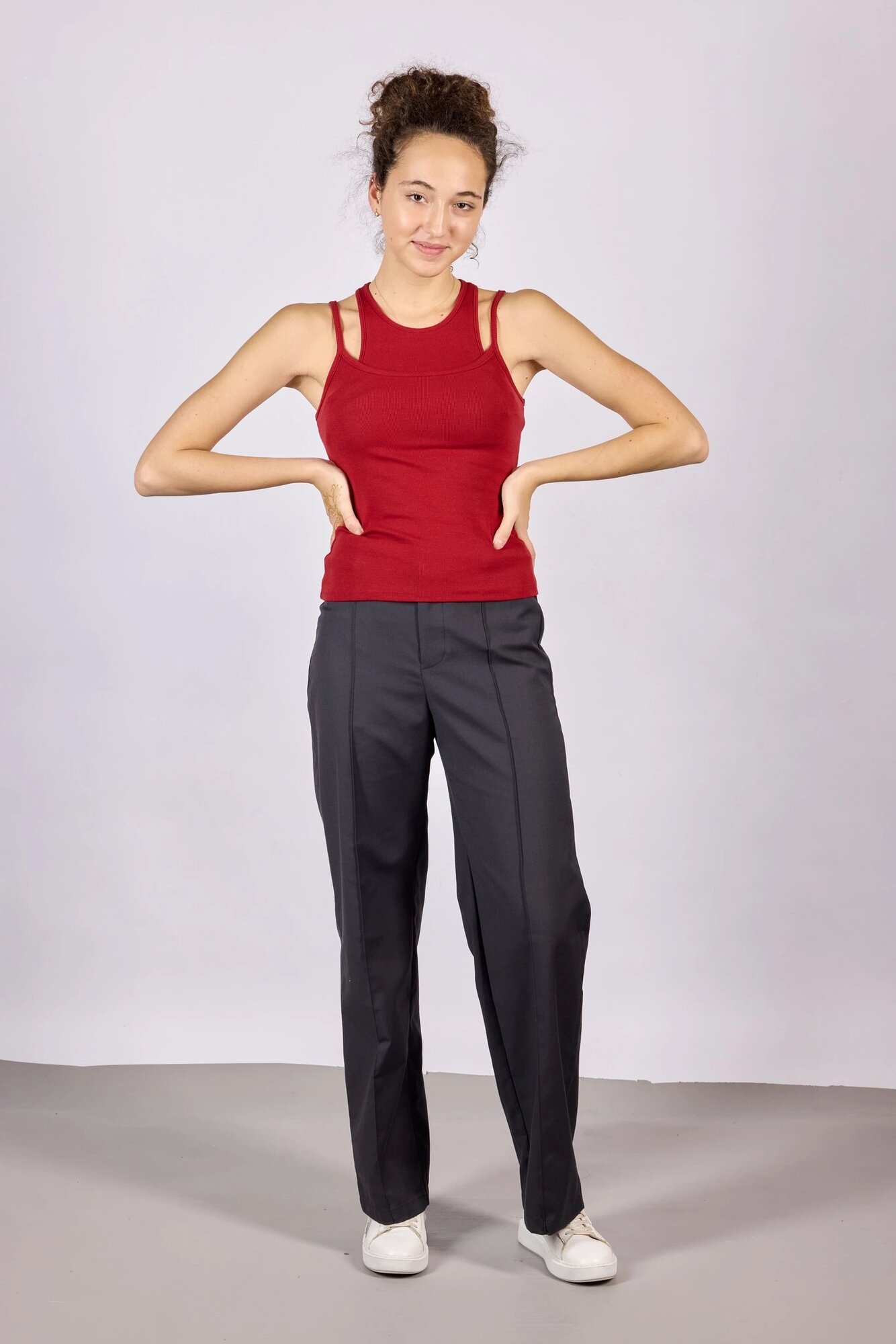 Двухслойный топ-обманка на тонких бретелях — стильный и удобный элемент гардероба. Изготовлен из эластичного материала с текстурой в рубчик, что обеспечивает идеальную посадку и комфорт на протяжении всего дня. Этот топ идеально подходит для создания как повседневных, так и спортивных образов, сочетая в себе элегантность и практичность.